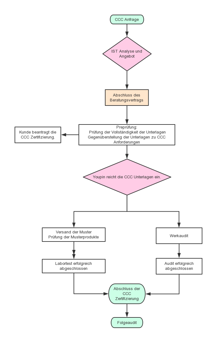 CCC Zertifizierung ist die Abkürzung für "China Compulsory Certification". CCC Zertifizierung wurde von der chinesischen Regierung aufgrund des Beitritts zur WTO eingeführt, um international anerkannte Standards zum Schutz der Verbraucher, Tiere und Pflanzen, der Umwelt und der nationalen Sicherheit zu gewährleisten. Das 3C-Zeichen ist kein Qualitätszeichen, sondern eine grundlegende Bescheinigung. Alle im obligatorischen Produktzertifizierungskatalog aufgeführten Produkte müssen von der vom Staat benannten Zertifizierungsstelle qualifiziert sein. Alle Produkte brauchen das entsprechende Zertifikat und müssen das Zertifizierungszeichen anwenden, bevor sie verkauft, importiert oder für geschäftliche Aktivitäten verwendet werden können.